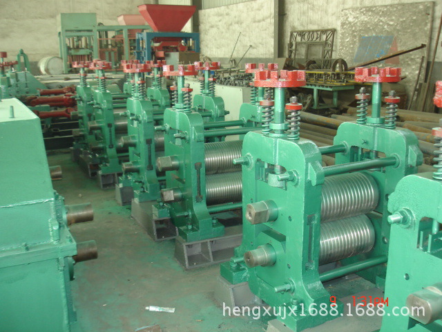 連續(xù)小型軋機(jī)所用坯料一般是連鑄小方坯,邊長一般是130-160mm,長度一般6-12m左右,坯料單重1.5-3噸。軋制線多為平立交替布置,實(shí)現(xiàn)全線無扭轉(zhuǎn)軋制,根據(jù)不同坯料規(guī)格和成品尺寸有18、20、22、24架的小型軋機(jī),18架為主流。目前棒材軋制多采用步進(jìn)式加熱爐、高壓水除鱗、低溫軋制、無頭軋制等新工藝,粗軋、中軋則向大坯料及提高軋制精度方向發(fā)展,精軋機(jī)主要是提高精度和速度,較高速度可達(dá)18m/s,產(chǎn)品規(guī)格一般為Ø10-40mm,也有Ø6-32mm或Ø12-50mm的。生產(chǎn)的鋼種為市場大量需求的低中高碳鋼、低合金鋼。其生產(chǎn)工藝流程是:步進(jìn)式加熱爐→粗軋機(jī)→中軋機(jī)→精軋機(jī)→水冷裝置→冷床→冷剪→自動(dòng)計(jì)數(shù)裝置→打捆機(jī)→切料臺(tái)架。