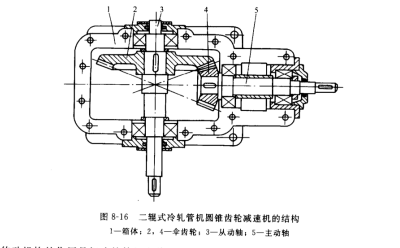 主傳動的減速機有圓錐齒輪減速機和圓錐-圓柱齒輪減速機。用圓錐齒輪減速機的優(yōu)點是∶主傳動可布置成與軋制線平行,以減小機列的寬度。圓錐齒輪減速機的結(jié)構(gòu)如圖 8-16 所示,在箱體1中安裝著2或3個裝在主動軸5和從動軸上的傘齒輪。