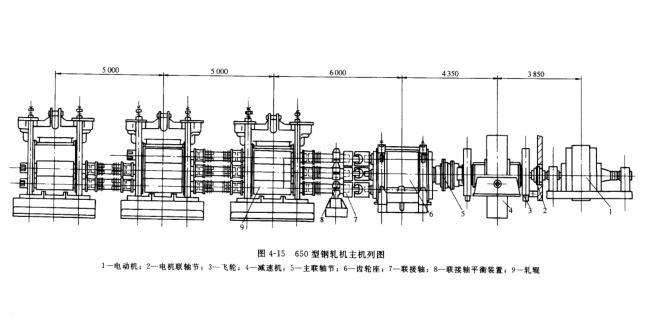圖4-15所示為650型鋼軋機(jī)主機(jī)列圖,電動機(jī)1的運(yùn)動和力矩通過電動機(jī)連軸節(jié)2,減速機(jī)4,朱連軸節(jié)5,齒輪座6和連接軸7傳遞給軋輥9,在此傳動中設(shè)置了飛輪3及聯(lián)軸節(jié)平衡裝置8.