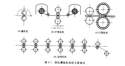 熱軋薄板有單張生產(chǎn)和成卷生產(chǎn)兩種生產(chǎn)方式,圖6-1所示為熱軋薄板軋機的主要型式。單張熱軋薄板主要是在單輥驅動的二輾不可逆式軋機上用疊軋的方法進行生產(chǎn),國內1200疊軋薄板機屬于這一類,其成品厚度為0.2~3.7mm。這類軋機工藝簡單,設備少,故投資少,建廠快。但其勞動強度大,生產(chǎn)率低,金屬消耗大,板材表面質量不高,目前處于淘汰地位。