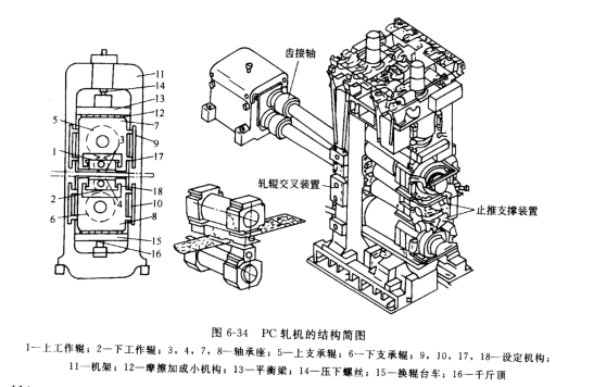 圖6-34所示為軋輥成對(duì)交叉布置的 PC軋機(jī)結(jié)構(gòu)簡(jiǎn)圖,上、下工作輾(1、2)的軸承座(3、4)分別裝在上 、下支承輥(5、6)的軸承座(7、8)中,上工作輾輸編與上支承輥軸線大致保持平行。上、下支承輥軸承座的位置設(shè)定機(jī)構(gòu)(9、10)固定在機(jī)架(11)的兩側(cè)。上、下支承輥軸承座還能借助于驅(qū)動(dòng)機(jī)構(gòu)沿軋制方向移動(dòng),或保持在所定的位置上。上支承輥軸承座通過摩擦力減小機(jī)構(gòu) (12) 由平衡梁(13)來支承,而平衡梁通過壓下螺絲(14) 把軋制力傳給機(jī)架。 下面一對(duì)軋輥承受的軋制力通過摩擦力減小機(jī)構(gòu)傳給換輥臺(tái)車(15),較后通過液壓千斤頂(16)傳給機(jī)架。上、下工作輾軸承座的位置設(shè)定機(jī)構(gòu)(17、18)也可借助于驅(qū)動(dòng)機(jī)構(gòu)使上、下工作輥軸承座沿軋制方向移動(dòng),或固定在所定位置上。